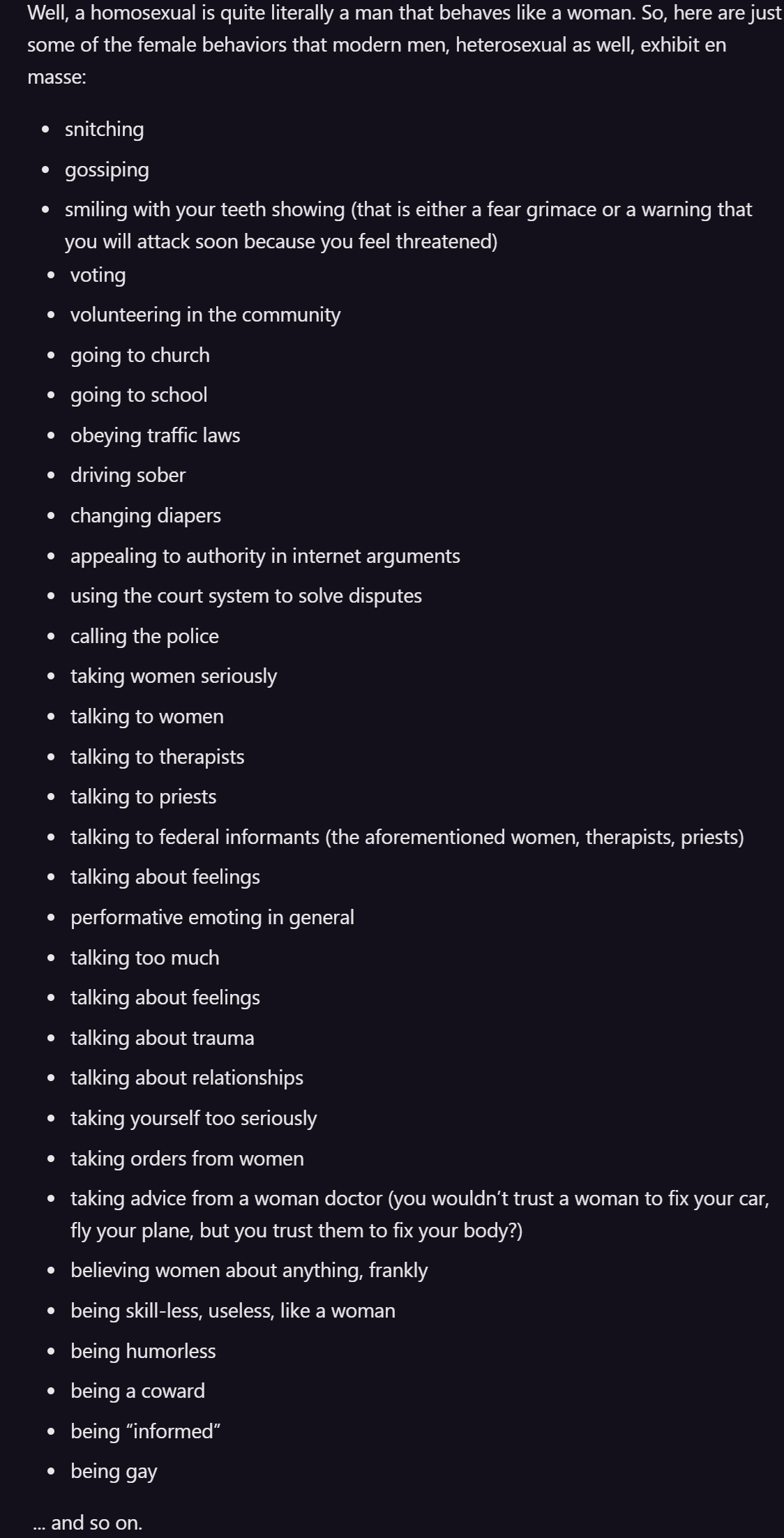 >Conscious rejection of women feels satanic to me.