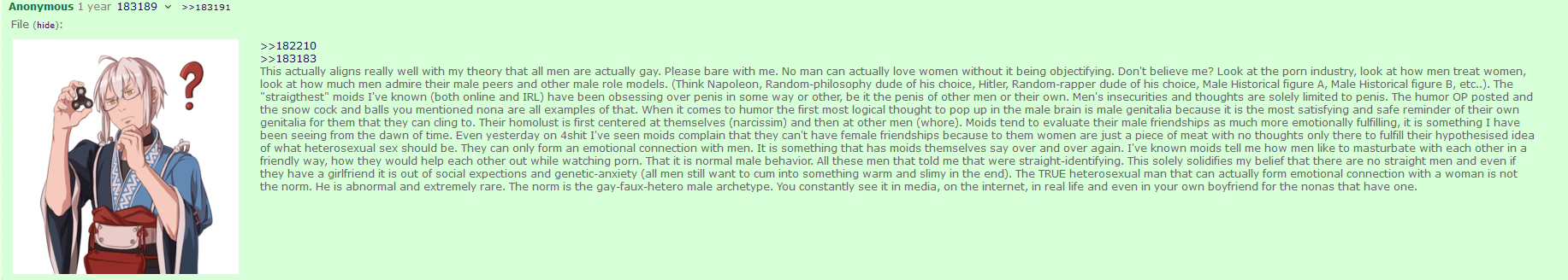 But the gay is mostly coming from rape victims and people with fucked up hormone levels mostly. Civilization turns more gay the longer it goes on, there is a reason religious fundies ultimately get a crack at power.