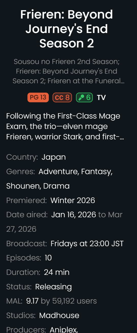This thread is for Frieren season 2. The first episode premieres on Friday, January 16th 2026 and we will watch it at 10PM EST. The magnet will be posted when it's available.